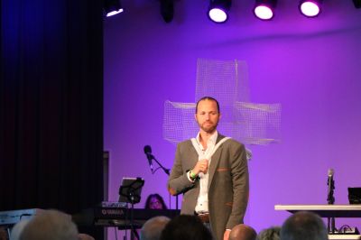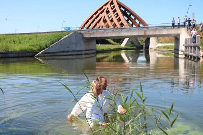 Bandstra kwam binnen met un krús fan kipegaas op’e ruch en preekte ferfòlgens over Lukas 9:23, ut gedeelte út ut Evangely wêr’t ut gaat over ut fòlgen fan Jezus Kristus. Ut tema was ‘Geloof òf gefoël’. De echte reden dat ik bij dizze diënst anwezech was, was ut bijwoanen fan un spesjale doopplechtechheid in de open lucht.