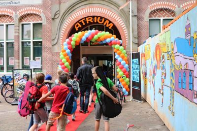 Vandaag was er in het Atrium van Sneek een auditie. De deelnemers, waaronder die van de Bonifatiusschool uit Sneek, gingen door een poort van kleurige ballonnen naar binnen.