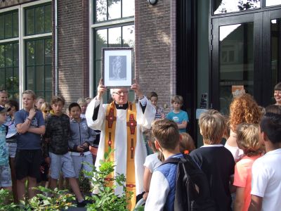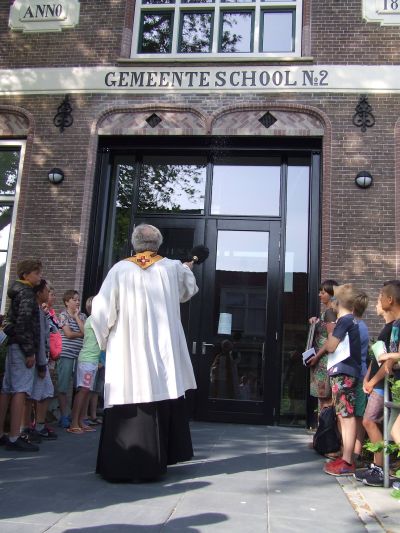 Fanmòrren het pastoar Peter van der Weide de nieuwe dependance fan de Sint Bonifatiusschool Bonnetop insegend. Fia maat Kees Poiesz kreech ik enkele fraaie foto’s fan dizze plechtechheid. Skoal staat, prachtech restaureard an de Looxmastraat.