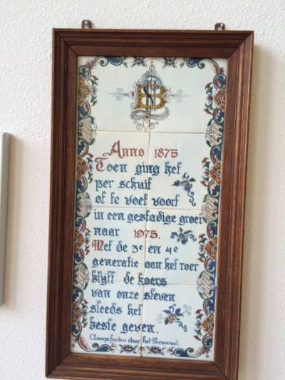 Toen ik ut bedriëf fan de Lampes binnestapte sach en rúkte ik futdaleks dat ut un family ondernimming is. Ik sach nyt allienech de foto's fan de groanlêgers fan de firma Lampe, mar ok un prachtech tegeltableau dat bij ut 100 jarech júbileum skonken was deur ut personeel! Ik hew der met myn telefoantsje even út de heup un foto fan maakt! Ut ferhaal leze jum fanneweek in GrootSneek.