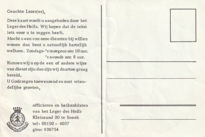 At ik dan later op’e avend de Witte Kat/Rinke ferliet foar de Scotch Inn òf de Sneeker Pan, kwamen je regelmatech de Heislsoldaten teugen. Altyd deponerarde ik dan wat losgeld in de bus met gleuf. As dank kregen je dan un moai kaartsje met un bibeltekst.