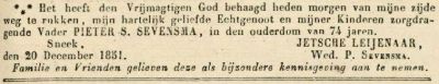 Gister reagearde Wim Slagter met de fòlgende mail: Afgaande op de genoemde jaartallen gaat het hier om Pieter Sipkes Sevensma (Sloten, 22. 8.1777 – Sneek, 20.12.1851), op 9. 1.1806 gehuwd met Jetsche Ykes Leijenaar (Workum, 5.12.1786 – Sneek, 18. 1.1866). Hij was bakker in Sneek en leden van de familie Sevensma oefenden ook nog generaties nadien dat beroep uit.