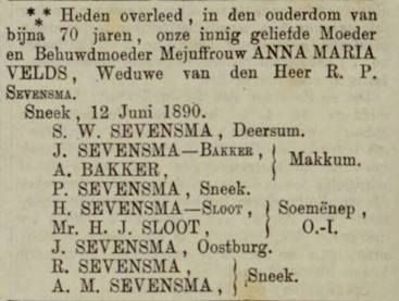 Ten minste een van de zoons, Ruurd Sevensma (1819-1871), trad in de voetsporen van zijn vader en vond ook zijn bruid in bakkerskringen: Anna Maria Velds (1820-1890), dochter van Steven Wijnand Velds (1798-1862) en Hendrika Brander (1797-1870).