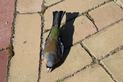 Foto hew ik foarege week in Earnewâld nommen. Fogeltsje (fink?) was teugen un rút anflogen. Het ut dus nyt overleefd. Poatsjes omhooch, is noait goëd bij un fogel. Bij minsen is ut met de neus omhooch nyt goëd.
