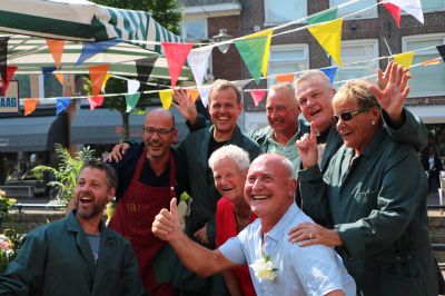 Sneek- Even rond de klok van vier uur was het moment daar: Bloemkoopman Theo Ruis trekt zijn groene schort uit en zijn vaste stekje op het Grootzand wordt overgenomen door oud-collega’s en werknemers. Stadsomroeper Jan Sjoerd de Vries, in vol ornaat, neemt het woord onder een regen van confetti en dondert de bronzen stem over de markt: