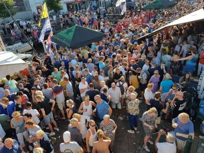 Op het dek van ‘de Dorstlesser’ stonden divers zomers gekleede Putkapelfans te swingen en te drinken. Regelmatig werd er een bommetje gemaakt, wat zo nu en dan toch wel even link was als er bootjes met buitenboordmotoren langs voeren.