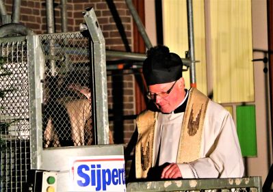 Parochieraadslid Piet Bouwhuis, ging samen met pastoor Peter van der Weide in een bouwlift naar boven. Daar op grote hoogte sprak de RK voorganger in alle vier windrichtingen de zegen uit.