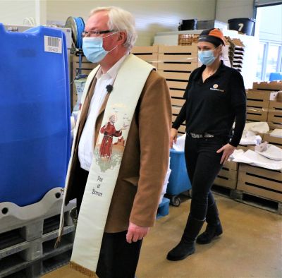 Pastoor Peter van der Weide van de Sint-Antonius van Paduaparochie van Sneek, Heeg en Blauwhuis bij Venemafood heeft vanmiddag de zegen uitgesproken over duizend oliebollen.