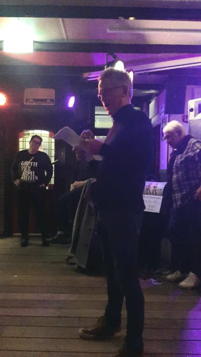 Ut wurdde un onfergeteleke avend, ut klopte allemaal. Un soad públyk dat andachtech lústerde naar de ferhalen, fol fan eroatyk op ut ies! Kroechferhalen, jaseker ok over dij Beppe Beest! Noait sal de foarbips mear utselde weze, sinds gisteravend toen Willem Schoorstra de fagina ‘stikelbaarch mei in iepen rechje’ noemde. Dêr sat ik dus bij hè, op un meter oustaan: ‘Meistû it wat leie mantsje…’