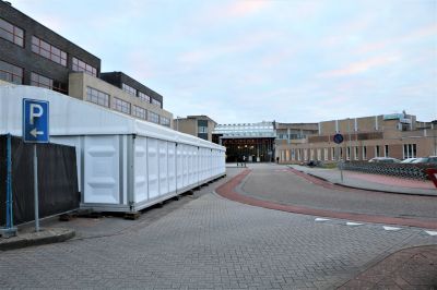 Dat woard sinister, skoat mij gisteravend in't sin toen ik dy groate witte tent foar de ingang fan oans Sint Antonius sikenhús staat sach. Onheilspellend, naargeestech en helemaal nyt frolek.