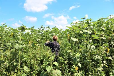 “Wij zijn begonnen met het plaatsen van zonnebloemen rond het maisveld. Daarmee voorkom je dat roeken vanaf de zijkanten in het gewas begonnen te pikken. De zonnebloemen zorgen er dus voor dat de maiskolven letterlijk op een mooie manier bescherming bieden. Nadat dat gelukt was, kwamen we al snel op het idee om de zonnebloemen te verkopen. We knipten ze zelf en brachten de boeketten naar de winkels bij ons in het dorp. De volgende stap was om bezoekers zelf de gelegenheid te geven de zonnebloemen uit te laten zoeken en af te knippen, drie stuks voor een euro. En er staan er genoeg.”