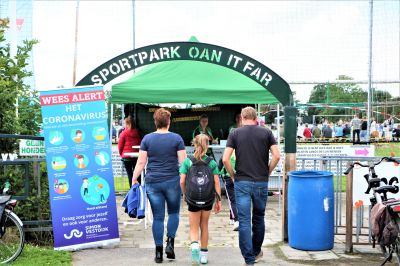“Der meie 250 minsken bij dizze wedstryd wêze. Der binne ek 250 minsken en we hawwe fansels ús frijwilligers dy’t hjir oan’e gong binne. En bern ûnder de 18 jier telle net mei. Mar earlik is earlik we hawwe ek minsken keard. Dy moasten dan even yn’e wacht stean. Echt 250 besikers, safolle meie we talitte en dat is’t. We hawwe op it fjild looprichtingen en at de minsken binnen komme moatte de hânen earst desinfekteard wurde en de nammen opskreaun. Elkenien wurdt dus registreard en at se in konsumpsje ha wolle dan gebeurt soks ek wer coronaproof. Oeral om it fjild stean banken en minsken moatte ôfstân hâlde. En elk docht dat ik, want it keatspublyk wit dat se har oan de regels hâlde moatte. Sa net, dan gripe we yn.”
