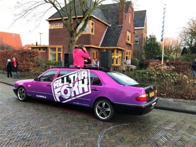 SNEEK- In no-time veranderde vanmiddag de voortuin van de jarige Wigle Sinnema (60) in een klein festivalterrein. Rond de klok van 16.00 uur stopte de All Tha Fokk roze limousine voor de voordeur van de oud-wethouder van Sneek/SWF.
