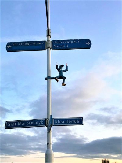 Toen ik terchreed hew ik de kreasy tòch mar even op'e foto setten. Sit der un betekenis achter? Het ut mantsje un naam. Wat is syn skepper(m/f). Hoe langer ik der over nadocht hoe mear ik begon te fantasearen. Mar bij de wee: Wie weet hier mear over te fertellen. Jum magge ok gewoan ferder fantaseare, ut is in elk gefal even wat anders as Trump & Covid-19!