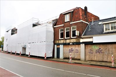 Opvallend aan deze foto is dat de appartementen die tijdelijke transformatie ondergaan, er over een tijdje weer keurig bij staan. Of dat met de foeilelijke puist, die niet is ingewikkeld, ook het geval zal zijn is uiterst twijfelachtig.