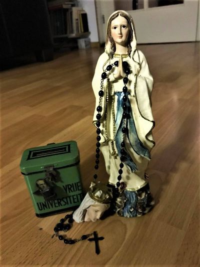Myn Roomse beeldsje staat in myn werkkamer, tegare met ut VU-blikje. En oh ja, de kòp fan un ouwer Mariabeeldsje overleefde de boase Griffemearde blikken fan Abraham Kuyper nyt..