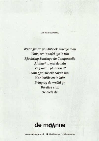 Ut kan dêrom ok sumar weze dat un bepaalde leeftydskategoary dy’t ut fòlgende poëtise proazastukje hoart, denkt fan ‘waar heeft die kerel het over’. Stel dan mar fragen, want fan fragen wurde je wiis.