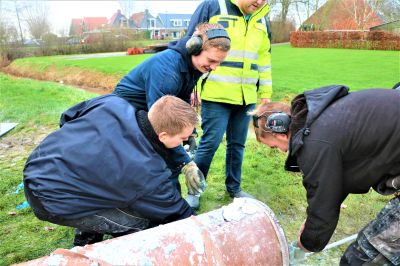 OSINGAHUIZEN- Even voor de klok van vier vanmiddag zwijgen de carbidkanonnen in Osingahuizen bij Heeg. Een grote groep jongeren uit Osingahuizen heeft zich verzameld rond een aantal melkbussen en twee ‘carbidkanonnen’ als er twee Handhavers van de gemeente Súdwest-Fryslân arriveren. Dan is het uit met het geknal.