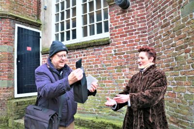 Akke Cleintuar-Elgersma (57), de aanjager van het Sneker eerbetoon duikt weg in haar winterjas. Ze geniet zichtbaar. In de tas die ze meegenomen heeft zitten twee plakboeken vol met knipsels van de Golden Earring. En een fles rode wijn voor de stadsbeiaardier. Dat komt later.