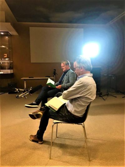 Wat ik fanmòrren in Liwwarden moest? Tegare met kunstskilder Hendrik Eilings, fotografe Baukje Venema, útgever Eddy van der Noord ( Utgeverij Louise) en 10 andere dichters (m/f) hewwe wij de skitterende bundel ‘Iisbaan yn’e maaitiid’ maakt. Fanmòrren mochten Gerard de Jong en ik oans fers ‘op kamera’ foarleze. Dêrbij interviewde we mekaar ok nòch kòrt. Ja, jum magge ut wel un flog noeme. Haye Bijlstra filmde oans tweeën.