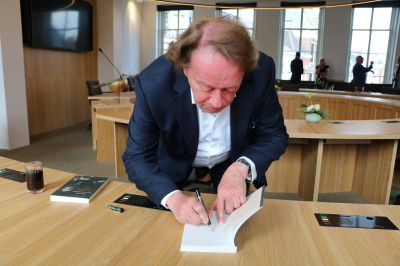 Biograaf André Vermeulen sinjeart myn eksemplaar fan de biografy