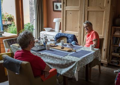 Fanmòrren tegare met fotograaf Tom Coehoorn bij ferteller Bennie Huisman, Heerenfeen weest. Ik hew Bennie interviewd foar de Friesland Post seary 'Fertellers yn Fryslân'. Su as alle kearen was ut diskear ok wear heel plezierech interviewen. Tom maakte de foto terwyl ik Bennie an de keukenstafel interview. Moai man!