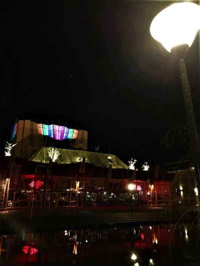 Fanou de groate teatertoren fan Theater Sneek an de Westersingel skine de lichten hoopfo in fraaie kleuren. De dach dat alles (nou ja, 'alles' ) wear goëd komme sal, komt hieltyd dichterbij. Moedech foarwaarts!