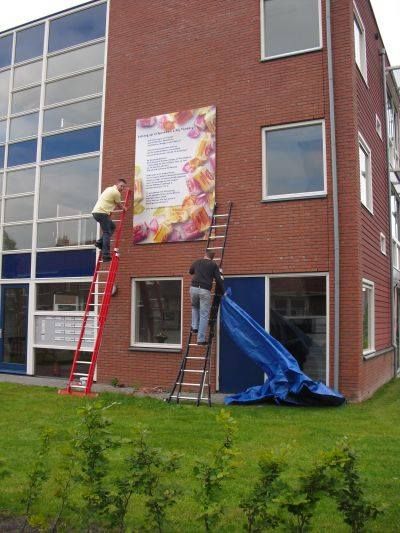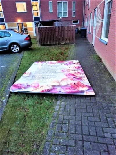 En wat te sêgen fan burgemeester Hayo Apotheker dy’t de haan der nyt foar omdraaide en lees ut fers dat hij nòch nyt onder ogen had had, spontaan foar. Dizze man het wat met ut stads, laat dat dúdelek weze! Naast de anbieding fan de plakette het de wykfereniging ok nòch un heel groat kanfasdoek met dêrop fers + foto kregen. Ok binne der mar liefst 700 eksemplaren op fraai papier drukt dy’t an de buurtbewoaners kado geven wurde. Ut kan nyt op. Moai man! Hierbij un antal foto’s fan de happening dy’t fanmòrren froech al begon met ut ophangen fan de plakette. Dizze hele week is ut nòch feest in de buurt.”