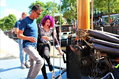 Ferfòlgens na ut fok hijsen an dek fan de Sneker Pan. Geweldege sfear dêr an’e Oasterkade.