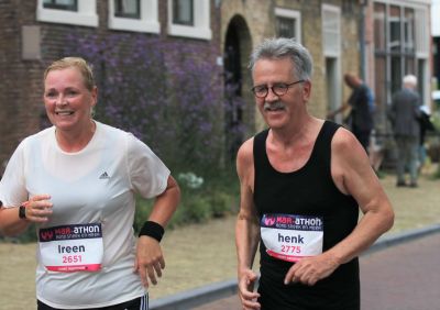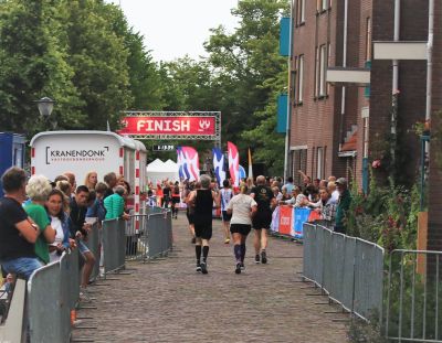 As un mokerslach foëlt de Akwadukttunnel an, de kilometers beginne te tellen. “Ik ga dood”, sist Ireen. Nyt dat ik har loof en ut helpt ok nyt. We dribbele deur en lade oans op foar ut laatste deel in’e stad. Un gloarieuse intocht at we de Waterpoartsgracht opdraaie en ut blauwe finishdoëk siën. De gele Van Gogh sonnebloemen wurde dankber in ontfangst nommen. De klòk staat stil op 1 uur en 12 minúten. Un eufoarys gefoël maakt sich fan oans meester. Domwech gelukkech an’e rane fan ut Martiniplein!