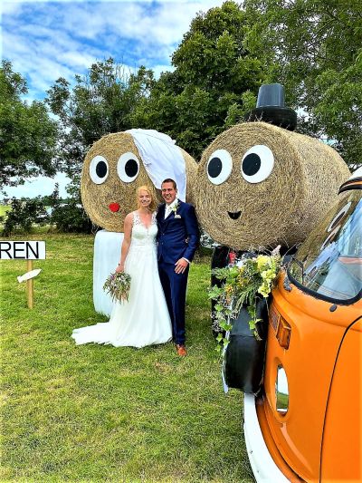 Bruidspaar Janine & Andries Kramer wilden best even poseren voor de grasbalen. “Sa binne we ek ris posityf yn it nijs!” Het feest vindt op en rond de boerderij plaats.