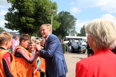 Kinderen van de basisschool uit Heeg, die kort ervoor nog aan het surfen waren, vormden een erehaag voor de Koning. De kinderen vonden het maar wat een eer om de Koning op hun manier ( ‘box’ !) welkom te mogen heten. Een van de kinderen riep luid en duidelijk dat hij z’n hand na de box met de Koning nooit weer zou wassen. Een andere was ook eerlijk: “Ik hie leaver trochsurfen bleaun…” Willem Alexander gaf aan dat Heeg bekend terrein voor hem is, in zijn jonge jaren was hij regelmatig als zeiler op het Heegermeer te vinden met z’n vrienden.