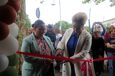 SNEEK- Sinds 1 mei van dit jaar draait het restaurant van Just JP aan de Wijde Noorderhorne in Sneek. Op 27 april jl. sloot het restaurant haar deuren van oude locatie aan de Leeuwarderweg in de Waterpoortstad. Vanmiddag opende wethouder Marianne Poelman samen met medewerkster Carlijn officieel de deuren van het prachtige nieuwe restaurant. Dat deden ze door een roze lint door te knippen. De andere medewerkers gingen vervolgens achter de wethouder en hun collega aan over de drempel van het prachtige nieuwe onderkomen.