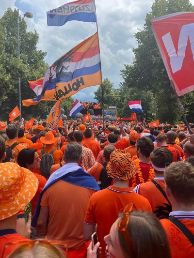 De sfear is fantastys, un seldsem fòlksfeest wêr’t wij de hele dach fan op’e hoogte houden binne, de spanning stijgt! Der binne mar liefst hondert dúzend (100.000!) Nederlanders in en bij ut stadion. Ongekend.