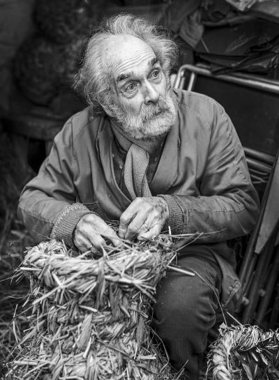 Illustratief voor Simen Jellema, eigen Friese spelling, creatief en handel op de vierkante centimeter! Z’n vrouw Sietske (‘ze is nog ouder dan ik, negentig, maar dat vindt ze niet leuk om te horen’) stuurt ons door naar ‘het hok’, daar is Simen druk bezig met het vlechten van de zoveelste eendenkorf uit z’n leven. Simen begint meteen te vertellen waar hij mee bezig is.