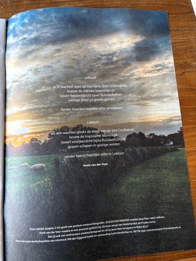 Ja. Su hyt dat in ut Engels at yts drukt is. Fandaach lagen de GrootSneek maart 2025 op’e kokòsmat, tegare met de Friesland Post fan april en ut magazine ‘Rabo & Co’ ,fan’e Rabobank. In alle bladen interviews, artikels en un tweetalech fers. Ik hew ut de oulopen perioade mar druk met had, mar ut is en bliëft moai om te públisearen.