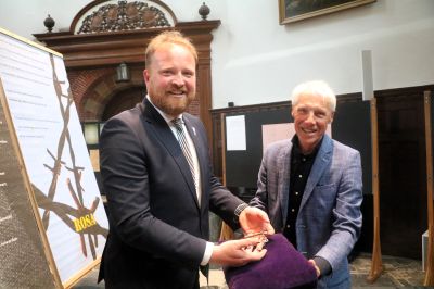 Een heel bijzonder moment vanmiddag was de overhandiging van de sleutels van de voormalige Synagoge uit Sneek aan wethouder Bauke Dam. Matthijs Graafland, archiefmedewerker van de Vereniging Historisch Sneek en beheerder van het Joods archief, kwam op het spoort van de sleutels en ook het oude muuranker, met de Davidsster, tijdens zijn speurtocht naar Joods verleden in Sneek.