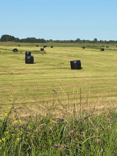 De omgeving het hier en dêr wat surrealistys met al dy groate grasbalen in plestyk op ut pas maaide laan. De fogels en de bermbloemen, je súden der ‘lyrisch’ fan wurde. Mar dat gaat mij krekt even te fer. Bin’k te nuchter foar.