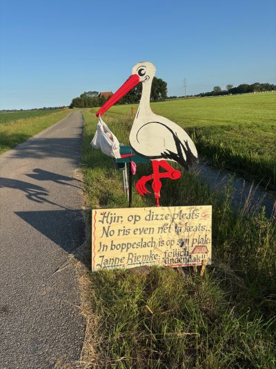 An ’e kant fan ’e Pasfeardyk, bij Loënga, twee prachtege poëtise Frysktalige keunstwerken dy’t de geboarte fan Janne Riemke ankondege. De skoanheid fan ut Friese plattelaan. Ik hou der fan, ok al bin en bliëf ik un stadsjonge.