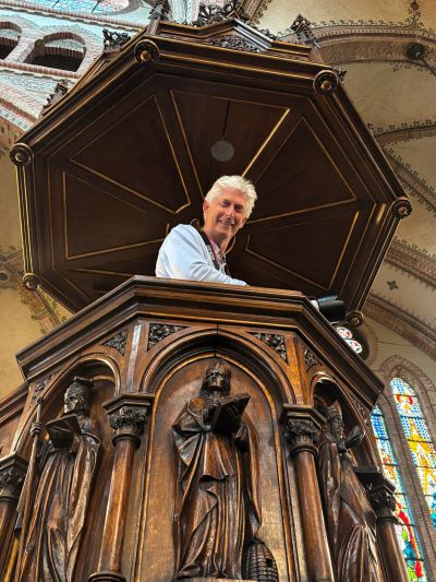 De foto bij dit dachboekstukje nam ik sundach foar un week. Maat Nico A. op’e preekstoël fan’e RK kerk an’e Singel in Sneek. Nico is un hearlek posityf insteld mins!