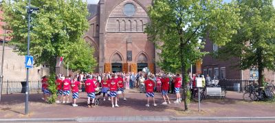 Na afloop van de ceremonie werd er op het kerkplein vrolijk geproost op het verse bruidspaar. De zon scheen uitbundig en zorgde voor een warme sfeer tijdens deze bijeenkomst. De Sneker Putkapel, kleurrijk en feestelijk gekleed in het herkenbare tenue van de Friese vlag, bracht een swingende serenade, waarbij de aanwezigen zichtbaar genoten. De vrolijke klanken vulden het plein en zorgden voor een spontane dans of glimlach bij menigeen.