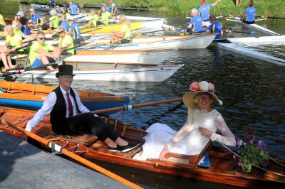 Tussen al dat dobberende hout en glanzend polyester stal één boot duidelijk de show: de bruidsboot Maria Louise. In dit sierlijke vaartuig zat een prachtig verkleed paar: De dames Vlaskamp als bruidegom (compleet met hoge hoed) en Wilkens als bruid in een stralende witte jurk met bloemrijke hoed. Het tafereel bracht zichtbaar plezier bij zowel deelnemers als publiek, dat zich langs de kades had verzameld om de vlootschouw gade te slaan.