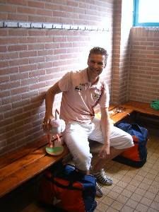 Ut rúkte fanmiddach wat apart bij oans in de boks, súver un bitsje un penetrante geur. De smearoaly dy't wij brúkten had wat wech fan antyksmearsel. Ut kraakt hier en dêr wat bij oans en dan wil dat spul nòch wel us helpe. Fanmiddach konnen we smeare sufeul as wij wúden, un overwinning sat der nyt in, we ferloaren fan N.O.K. 3 met 4-6. Gerard van der S. prestearde ut om um self swaar te blessearen toen ie over un stekje klom. Hoe krije je ut in de goedechheid foarmekaar. Omdat un brancard in gyn felden òf wegen te finen was, hewwe wij Gerard achter op de fyts bij syn broer Theunis setten. Su'n moaie klassieke hearefyts fan Phoenix de Sterke Vogel. Su binne we naar de boksen toekeutelt. Un pòtsierlek gesicht, en laat paparazzi Sjack Jansma dat nou krekt wear sien. Op de foto fanself. Sterkte Gerard!! Ik sal nou wear naar Frou de Jong, ik hew der wear nocht an en gaan der plat foar!