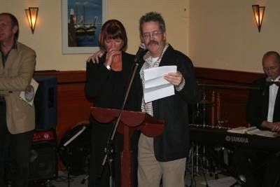 We hewwe der gisteravend mar un feestleke avend fan maakt, na afloop fan de Burger in Beeld-priisútreiking. Na un paar glazen lekker roaie wyn, un hearlek buffet ( met nyt te min an fis en flees ) en ok nòch wat na, konnen we oans mar opmake foar ut in ontfangst nimmen fan ut beeld dat Renée Pegel eksklusyf in opdracht fan Denion maakt had. Na de noadege blablabla hewwe Paul en ik ut mergelbeeld tegare in dank anfaard. Ik hew nòch wat moaie woarden seid, úteraard ok in ut Snekers, en wethouwer Jan Bargboer boad namens de gemeente twee flessen Weduwe Joustra berenburg an. Dit alles onder goëdkeurende blikken fan Hans Zoodsma, foarsitter fan Sneek Promotion. Ferrekte spitech dat Paul syn fototoestel nyt metnomen had ( 'ik ga daar niet aan het werk, ben jij gek!', sei de eigenwize Sneker Spakenburger ), nou mutte we mar afwachte òf Denion de foto's maile sal. Op de teruchwech naar Sneek wurden we nòch wear un kear op de foto setten, nou met un dúdleke flits! Dizze laaste prent kost un paar senten. Hoefeul: afwachte mar. Oans feestje eindegde bij Jan van Omme in de Ierse Pub, en apart is't we kwamen wear un moai soadsje bekende Snekers teugen. As je winne hewwe je altyd frynden, su is't tòch? Na un kòrte nacht ston ik fanmòrren wear foar un groep pubers in de gymsaal, nachts un kearel mòrrens un kearel! Fanmiddach de stad in weest, ok hier wear un opfallend soad bekenden teugenkommen. Ik had súver seare kaken fan ut praten, toen ik thús de tannen in un oalybol sette. Anne Oosterhaven het my fraagd om un presentasy op 22 desember te doën, mar dan hewwe wij op oans skoal de útfoering fan un kerstmusical. En saken gaan foar't meiske. De útnoadeging foar ut gouden Onder de Linden jubileumfeest ok kregen. Op 16 desember sal dan ok ut boek anboaden wurde. An wie en deur wie is nòch geheim. Ik hew fanmiddach ut omslach fan ut boek foar ut earst besien: jottem wat moai Paul! Krekt un resênsy naar de 'Sneeker ' maild, fanavend onderút foar Baantjer en mòrren hopelek foetballe. Ik bin der wel an toe.