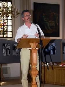Ik loop naar ut Oud Kerkhòf om te siën hoe’t de jonges fan Interlinie de panelen ophange, fan Poëzy op Poaten II. Even later is Tjalling Tjalsma fan Noflek der òk al. Tjalling sal de panelen befestege, mar earst leest ie ut Puchgedicht: