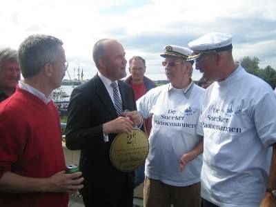 Fanmiddach foar ut earst dit seizoen an de lijn staan bij O.N.S. 1 Un hele aardege oefenpòt teugen un tè hard speulend Heerenveen ( am. )dy't met 6-0 ( kan der un doelpunt naast sitte ) wonnen werd. De sjarme fan su'n earste wedstryd na de somerstòp is de ontmoeting met Snekers dy't je un paar weken nyt siën hewwe. De fekaansyferhalen met stuk foar stuk ut thúskommen as hoogtepunt. De ferwachtingen foar ut nieuwe seizoen. De fermoeide koppen fan de échte Sneekweekfierders, su fan 'we binne hier wel, mar eigenlek wúden we òk wel even op bêd '. Ik hew se allemaal wear even observeard fanmiddach. C. òk, skaamteloas! Fanmòrren kreech ik de foto's met dêrop de Overhandiging fan de 2de Sneekerpannemannenerepenning "Sybold Hartkamp 24 juli 2003" an Burgemeester Arno Brok deur de Sneekerpannenmannen Hotze van Bekkum & Menno Kier Visser. Ut ferhaal achter dizze útreiking, gistermiddach op de Starttoren, is mij nòch nyt helemaal dúdelek. Ik weet wel dat Menno gister un prachtech moai ferhaal had. Orale literatuur fan un letterlek en figuurlek hooch gehalte!
