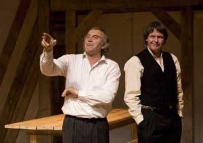 En dan myn earste kennismaking met ut tydleke teater. Ut is behelpen in seker opsicht ( garderobbe ), mar ut foëlt gewoan goëd. Je wete je dêr welkom an de Westersingel. Der is andacht foar ut públyk. Henk Wessels, húsmeester fan ut Pòstkantoarteater, begeleidt de 89 jarege emeritus dominee Keuning naar syn sitplak op de earste rij. De oud Meniste dominee seit later teugen mij: ' wat zijn de mensen hier toch vriendelijk!' Frouk Oostra, un échte gastfrou, dy't na ouloop fan de foarstelling tegare met un frijwilleger ut besoek fan un slukje en un ' flaubyt ' foarsiet.