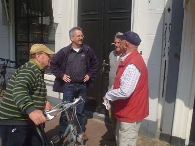 Tòpoverlech in ut hartsje fan Sneek: Leunend op syn fyts, Henk Stallmann ( foarsitter 'Vereniging Historisch Sneek e.o.' ), Henk van der Veer ( profesjoneel beroepsouwehoer ), Theo Aukema ( fameus siler en oud-ondernimmer ) en ome Joop Doevendans ( infloëdryk man met un ferskrikkelek soad Sneker petten op ). Foto is fan de bekende Sneker paparazzi Paul Ruiter.