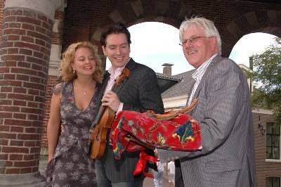 Wethouwer Tom Metz geeft un paar orizjinele deurlopers kado an Guido & Wendy: Fan harte welkom in Sneek! ( bovenstaande foto's fan Jan Douwe Gorter )