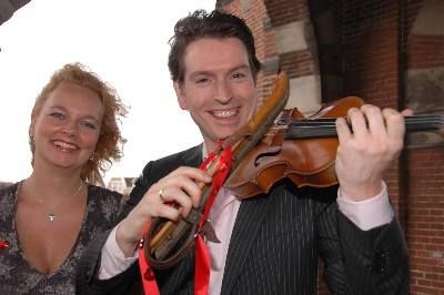 “ Ik heb nu al ontzettende veel zin in het concert van volgende week. Reken maar dat de vonken er vanaf zullen spatten ”, su liet orkestleider, dirigent, fioalsoalist en komponist Guido Dieteren wete. En Wendy? Sij straalde fan oar tòt oar. Inderdaad ut kyn het un engelachtege útstraling. Miskyn had Ben van der Knaap dêrom wel su'n hemelse blik in de ogen fanmiddach...